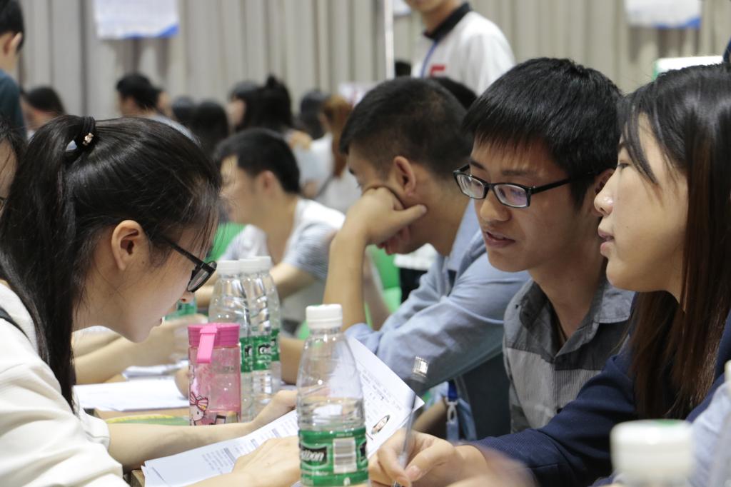 双选会现场十分火爆,多人聚集麦立方外的单位介绍栏查看此次双选会出展的单位,而延续往届双选会的惯例,每个招聘企业在其所在区域挂起了横幅,上面简明扼要地写出了所需职位、人数,让应聘者更方便得到招聘信息,大大提高现场应聘效率。本次招聘单位不仅要求应聘者对专业知识过硬,更要求应聘者对所应聘的职位有所兴趣,能在后期工作中投入更多的热情,为企业发展助力。同学们也积极向各个招聘单位提交自己的简历,并利用面试机会展现自己,而此次学院招聘区域还多了一道亮丽的风景线,每个应聘企业都配备了一名来自院内大一小班的志愿者来协助企业的应聘,这些志愿者表现积极,帮助维护现场秩序,引导双方和谈并积极与招聘方交流,让企业感到环境学院人性化的服务。