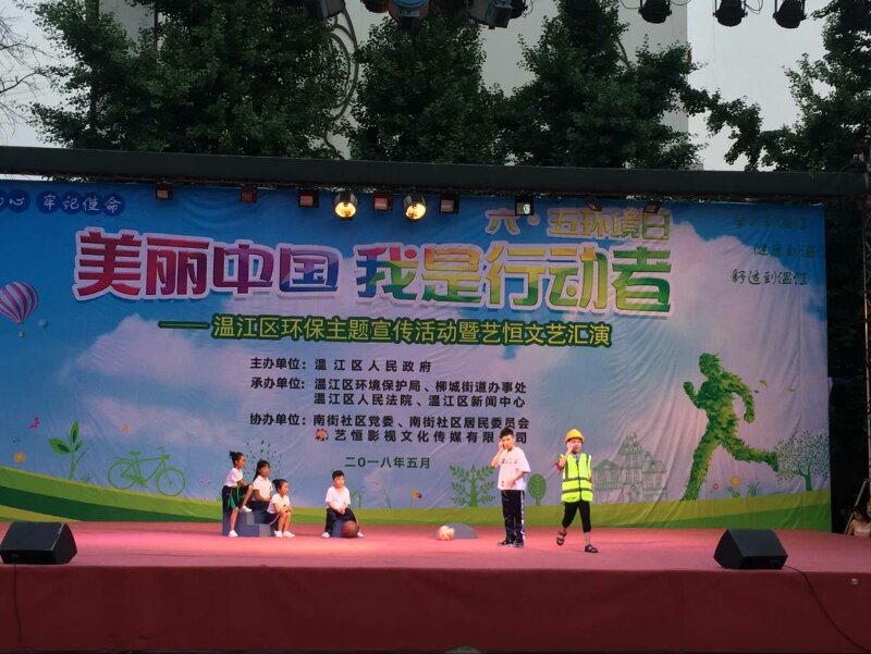 环保主题文艺演出由畅想绿色,呵护绿色和共享绿色三部分组成。快板《动物植物都是宝》提醒着在场的每一个人,在爱护植物的同时,也要保护动物,才能做到真正的保护生态环境。环保知识竞猜环节更是勾起了现场热闹的气氛,观众朋友们积极抢答,就连在候场区候场的小朋友以及嘉宾区观看表演的嘉宾都积极举手回答。演出中有很多小朋友参演,不仅体现了小朋友们对环境保护的重视,也让观众体验到了青春与活力的视觉享受。最后,朗诵《我爱你中国》,重新点燃了现场每一个人的热情,坚定了每个人为建设更好的中国而要从自己做起,努力改变环境的决心。活动结束,温江区法院宣布了成立环资合议庭的公告。