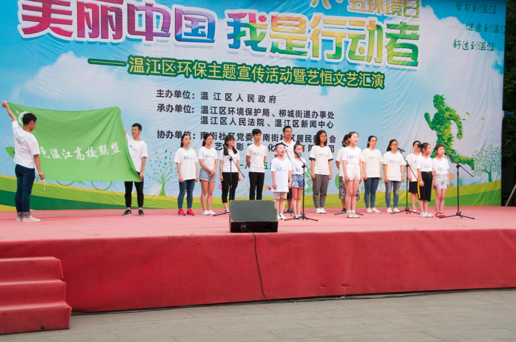 为推动社会各界和公众积极参与生态文明建设,共建天蓝、地绿、水清的美丽中国,5月25日下午,来自tyc5997太阳集团环境学院绿色温江高校联盟的7名志愿者前往温江区文庙广场,参与由温江区人民政府主办、成都市温江区环境保护局等多个机构承办,以“美丽中国,我是行动者”为主题的6.5环境日环保宣传暨文艺汇演活动。