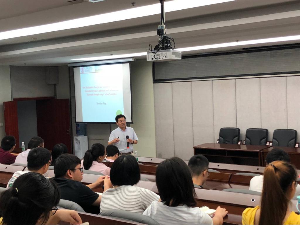 邢教授以生物炭和碳纳米管为吸附剂,环环相扣、层层深入的阐述了可电离有机化合物在碳材料上的负电荷辅助氢键吸附机制。该报告不仅仅证明了邢教授及其团队率先发现的负电荷辅助氢键(CAHB)是碳材料表面对可电离有机化合物吸附的新机制,更重要的是,他以此做为科研案例,阐释了在科学研究中如何抓住拟研究的科学问题形成科学假设,并如何有依据、有计划的设计实验来验证假设的重要思维过程。他勉励众学者要敢于假设,踏实研究,并热情回答了在场师生的提问,使大家不仅扩展了知识领域的新野新,同时明晰了做原创科研应有的思路。学院师生都表示在邢老师的报告交流中醍醐灌顶,受到极大的启发。