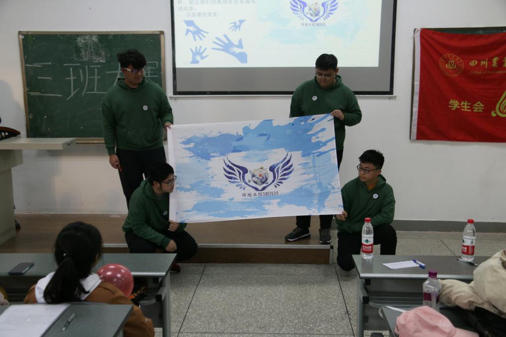 本次比赛中,每个小班结合ppt展示,将自己班的班徽、班旗、班牌、班服一一展示给在座观众,并向大家介绍了其设计过程与理念,当然也有十分新颖的形式来展示三班设计。环境科学201801和环工201801都用时装秀的形式,秀出班服风采,也彰显了班级的风貌。环境生态201801集体成员合唱了一首《我的未来式》,活泼的表演彰显了班级积极开朗的风貌;面对评委对于班旗的提问,答辩选手说道:“构图是一粒孤舟驶过千山万水,寓意我们不畏艰险,坚持前行的精神,与旗帜上的话呼应”。