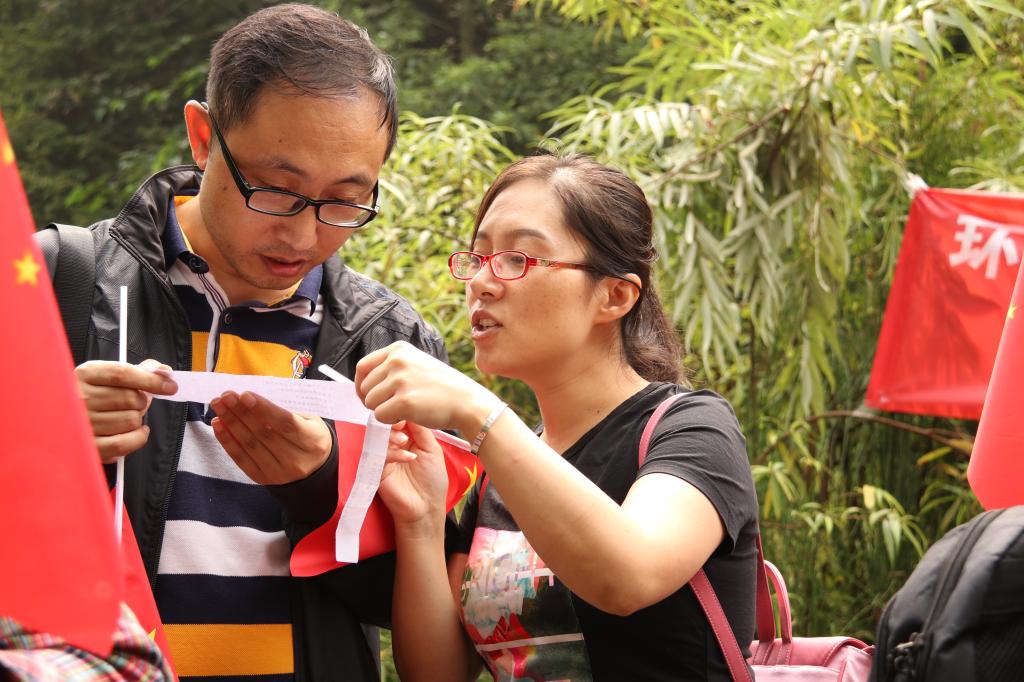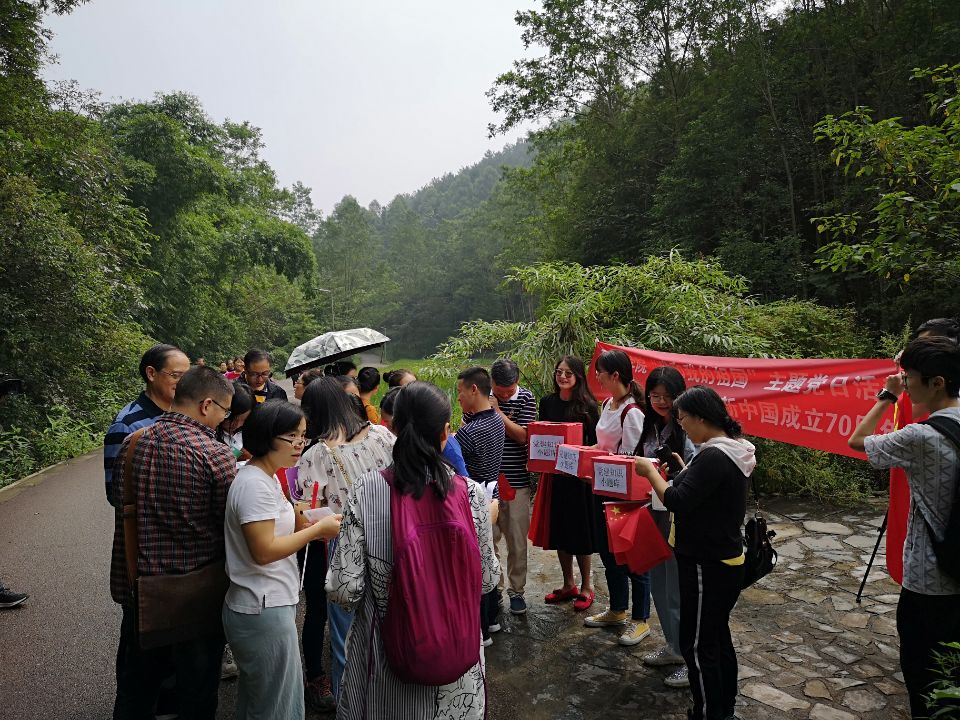在崇州竹艺村,到处洋溢着迎接国庆的喜庆,途径“我爱我的祖国”“祖国七十周年庆”展板和标识时,教职工手举鲜艳的五星红旗,面带灿烂的笑容,纷纷来到展板前合影留念,用自己的方式为祖国母亲七十周岁生日献上深深的祝福。沿着乡间公路一路步行,学院提前设置好涵盖党的基本知识、川农大校史等内容的“党建知识走廊”,服务的同志们早早等候在这里,不同的答题箱里准备了上百道知识竞答题,吸引了老师们积极参与,他们有的努力回忆学过的知识,有的三三两两和同事一起思考答题,有的打开学习强国APP复习知识点……现场气氛轻松热烈,置身青山绿水中,凉风习习,全体教职工全身心地投入到问答当中,用另一种形式为新中国成立70周年献礼。