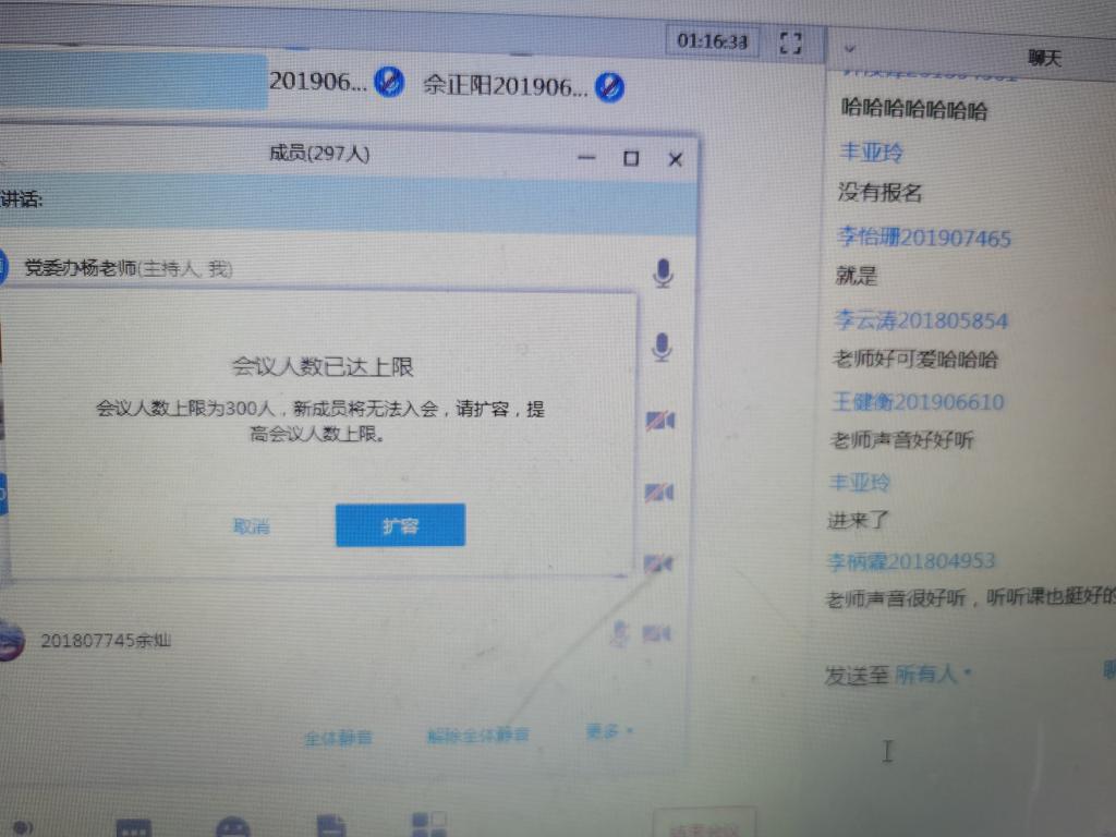 “我进不去会议怎么办?”“卡住不动是什么情况?”4月21日下午,环境学院学生群里一片“吐槽”,负责部门学生干部赶紧发声:“会议人数在二十分钟前就达到上限”,并且发出平台“人数已满,是否扩容”截图向大家表示“有图有真相”。原来,这天下午作为“辅导员讲堂”院级课程第二讲,环境学院党委办公室主任杨娟老师将为大家开讲《新冠肺炎疫情背景下的舆论博弈》。