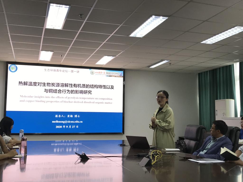 9月27日下午3点,由环境学院主办、生态环境研究所承办的“生态环保青年论坛”在7教305会议室举行。生态环境研究所黄梅博士为大家作题为《热解温度对生物炭源溶解性有机质的结构特性以及与铜结合行为的影响研究》。学院教师、部分硕士、博士到场聆听报告,报告会由生态环境研究所副所长沈飞教授主持。