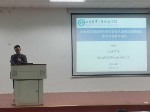11月11日晚上7点,由环境学院、生态环境研究所联合主办、生态文明(温江)研究中心协办的“生态环保青年论坛”在4A-102如期举行。第四讲的报告人是生态环境研究所田东博士,报告题目为“农业废弃物材料化利用的技术途径及应用探索”。报告会由生态环境研究所副所长沈飞教授主持,学院200余位本科生、硕士、博士及多名学院教师到场聆听报告。