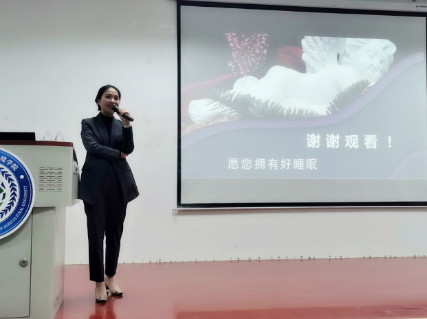高放护士长首先以“如何睡得好?”发问,然后从人们关于对睡眠的误解,失眠的缘由,人的睡眠周期以及帮助睡眠的方法几方面为大家进行了详细讲解。她指出,睡眠能促进人体的正常生长发育,对于保护人的心理健康与维护人的正常心理活动极其重要。而每个人的睡眠时间是不同的,偶尔一两次的失眠也属于正常现象,要正确对待睡眠。最后,高放护士长建议老师,同学们要探索自己的睡眠规律,建立起自我和睡眠之间的联系,调整关于睡眠的消极思维,这样会有助于大家的睡眠。