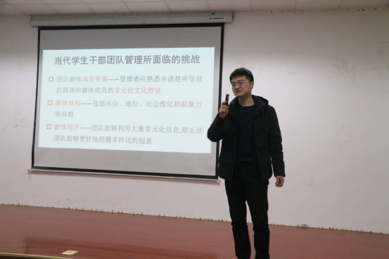 12月18日下午,环境学院学生干部培训暨2020年青马班第二次培训会在4教A102举行。学院党委副书记黄成毅作题为《学生干部的管理思维》专题报告,75名学生干部和青马班学员参加了此次培训。会议由学院团委书记李晓辉主持。