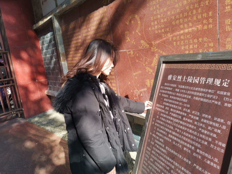 跨越成都和雅安两市的地域,共计十余名成员参与此次实践活动。鉴此小队成员也依据实际情况采取“兵分两路”策略分别于两市同时前往各地寻访足迹。1月22日下午15时团队部分成员于tyc5997太阳集团雅安校区老校区门前集合完毕,并一同前往邻近的烈士陵园进行参观和探寻。