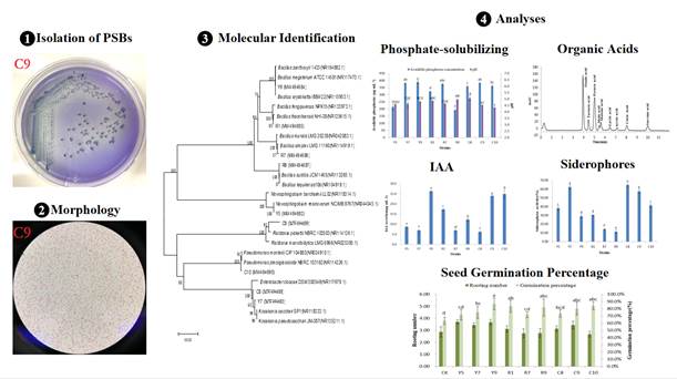 此外,团队在西南地区玉米-大豆间作条件下,从大豆根际分离筛选出9株解磷能力较强的解磷细菌(PSB)。16S rDNA测序和系统发育分析表明,这些PSB主要属于芽孢杆菌和假单胞菌,均能分泌大量有机酸,包括草酸、丙二酸、柠檬酸和琥珀酸。这些菌株都能产生吲哚乙酸(IAA)和促进植物生长的铁载体,进而促进相邻作物玉米种子萌发和植株磷积累。对减少农田生态系统化学磷肥的施用和促进农业可持续发展具有重要潜力。研究成果“Growth promotion ability of phosphatesolubilizing bacteria from the soybean rhizosphere under maize–soybean intercropping systems”(玉米-大豆间作条件下大豆根际溶磷细菌的促生长能力)在国际知名期刊Journal of the Science of Food and Agriculture(《食品与农业科学杂志》,中科院2区top, IF=3.638)发表(论文链接http://doi.org/10.1002/jsfa.11477)。