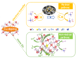 以前的研究表明,在过渡金属氧化物/PMS体系中,由于协同效应,双金属催化剂往往对PMS表现出更优异的催化性能。作为另一常见的过渡金属催化剂,金属硅酸盐体系对PMS优异的催化性能已被证实,但该体系中双金属的协同作用和协同机理却被忽视。基于过一硫酸盐(PMS)的高级氧化工艺在处理难降解有机污染物方面显示出巨大的潜力,因此,该研究通过在硅酸钴中掺杂Cu制备了双金属硅酸盐。通过评价其活化PMS降解四环素的性能,明确了Co和Cu在硅酸盐中的协同作用。进一步深入分析协同机理发现Cu掺杂同时促进了自由基途径和非自由基途径。值得注意的是,从微观机制的角度来看,Co是催化PMS的唯一活性位点。Cu掺杂通过与Co的电子转移来增强自由基途径而不直接参与PMS的活化。此外,Cu掺杂还形成了更多的氧空位,增强了非自由基途径。该研究成果揭示了硅酸盐中双金属的协同效应和协同机制,为双金属硅酸盐催化剂的开发提供了理论基础。