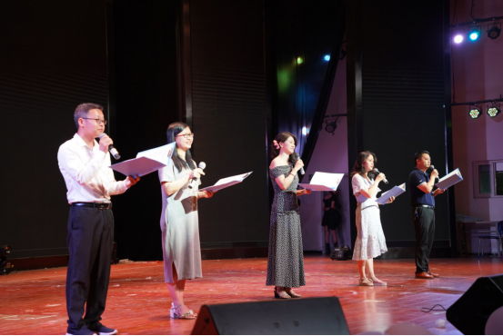 学院教职员工积极参与此次工会毕业季活动,以朗诵、红色声创配音、歌曲演唱等多种表演形式和毕业生同台献技。其中,节目《以青春之我,创建青春之中国》选自学院“红色声创大赛”品牌活动,由学院教师与学生共同完成现场配音表演,“一代人有一代人的使命,一代人有一代人的担当,一代人有一代人的长征路”,现场配音表演将在场观众带回那个觉醒年代,寄语全体毕业生在未来的工作、学习和生活中爱国奋斗、勤勉敬业、锐意进取。而学院毕业班班主任集体朗诵及班主任、助班的祝福视频,让毕业生重温他们这四年的美好时光。晚会现场掌声不绝,观众眼泛泪光,老师言语间饱含祝愿,眼中满溢不舍。此外,由教职工带来的欢乐秀活动也在精彩上演。