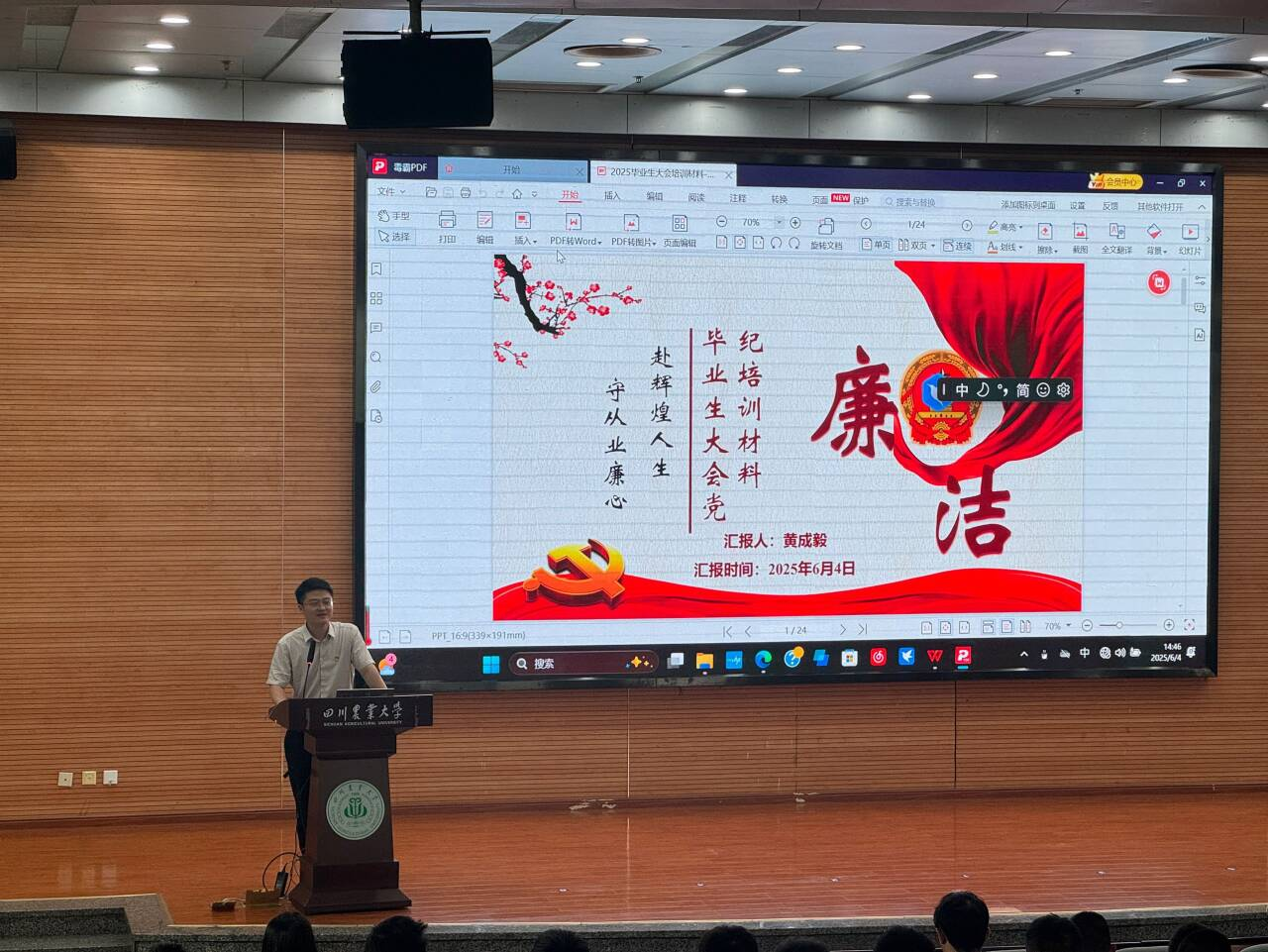 为深入推进主题学习教育,助力毕业生同学们在廉洁从业征程中锚定起点,环境学院于6月4日在下午二教报告厅开展以“守廉洁从业初心,筑辉煌人生前景”为主题的毕业生党员廉洁纪律专题党课。环境学院全体2025届毕业生参会,党委书记黄成毅授课。
