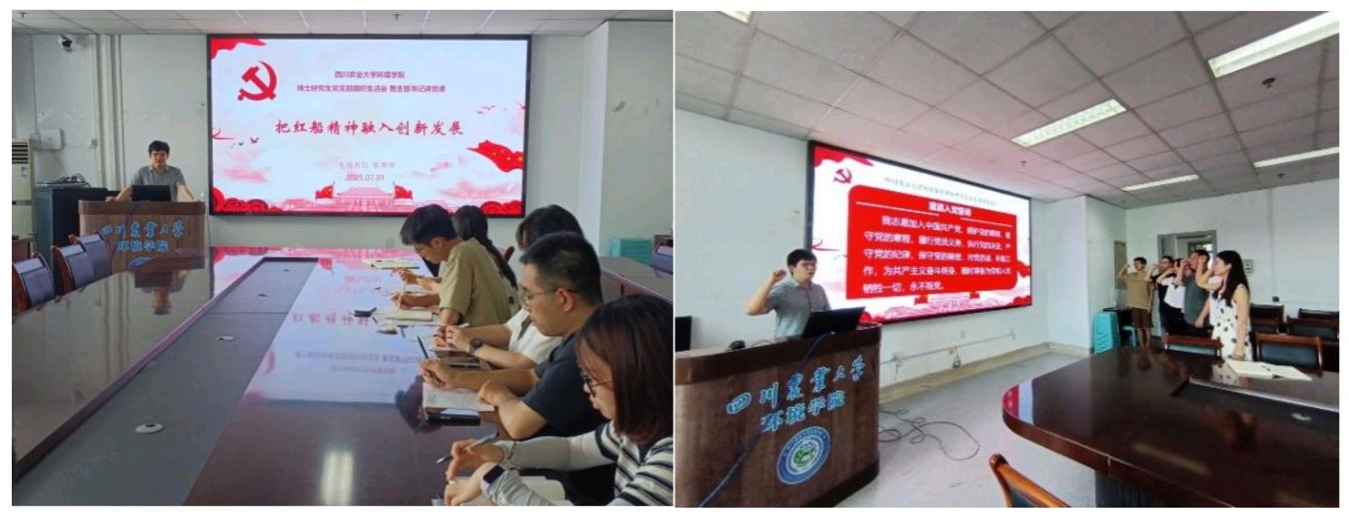 为进一步坚定理想信念,增强党支部的向心力和凝聚力,提升博士研究生党员的身份认同感、责任使命感和组织归属感。环境学院博士研究生党支部于7月1日这一特殊的日子在成都校区3-423B会议室召开了“把红船精神融入创新发展”主题党课暨党员集体政治生日活动。会议由博士研究生党支部书记蔡郡倬同志主持,党支部全体博士研究生党员参与活动。