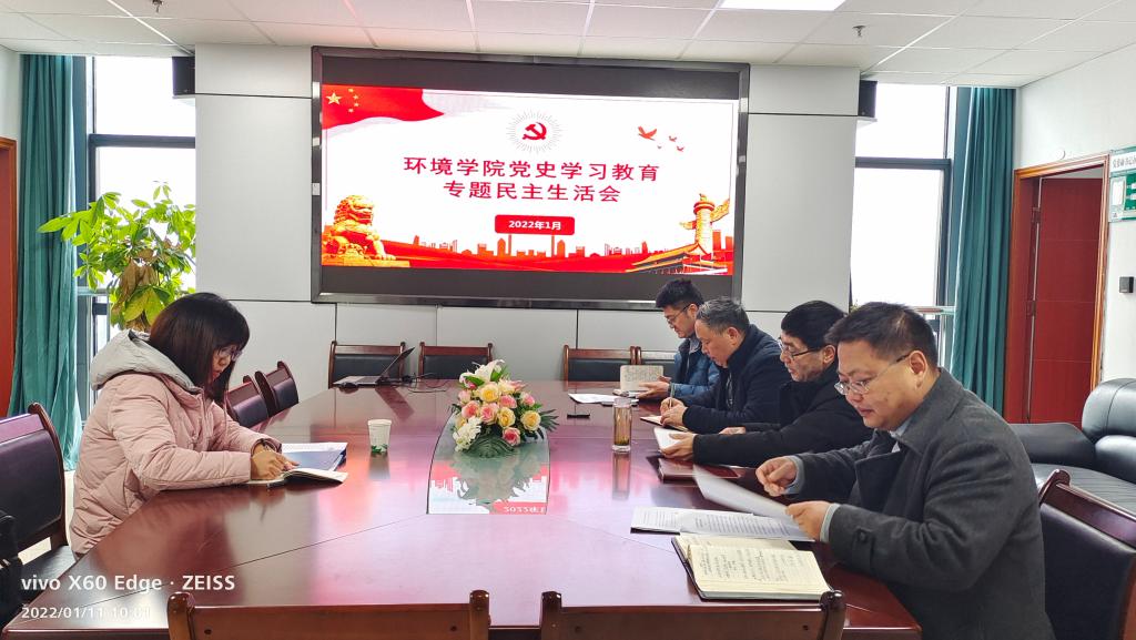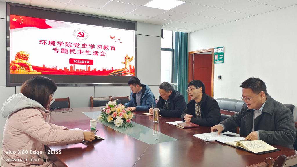 1月11日上午,环境学院在7教八楼会议室召开党史学习教育专题民主生活会。校纪委杜娟同志到会指导。学院党委书记聂坤伦、党委副书记黄成毅、副院长沈飞参会,学院院长邓仕槐列席会议。会议由黄成毅主持。