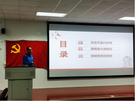 本次党校课程的主题是“弘扬川农大精神,牢记生态文明初心使命”,党课伊始,程章介绍了环院学院的本源与现状。引出了党课的第一部分:矢志不渝换川农情,为我们讲述了无数川农学子学成归来为母校做贡献的事迹;紧接着,程章开始为入党积极分子讲述艰难奋斗报国志;最后,以砥砺前行探索路为第三大部分,给我们展示了环院人为了创新发展所做出来的一系列措施。整堂党课气氛热烈,同学们在此次党课上反应热烈。