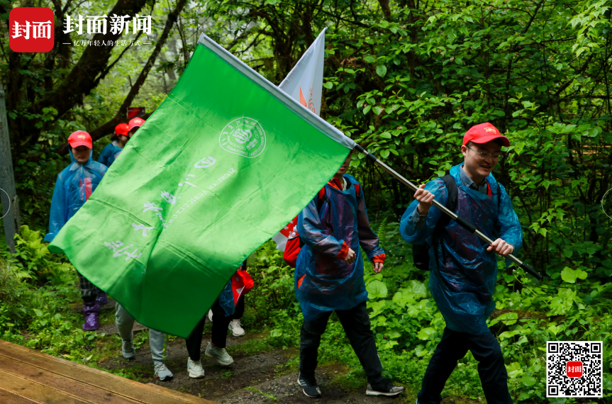 在沥沥细雨中,党员同志们高举旗帜,一路前行。他们从草海子出发,徒步进入苍茫的原始森林,湿滑的路面、泥泞的灌木丛林给队员们造成了不小阻碍。当大家一想到“脚下踩过的草皮,曾经就是红军当年踩过的路”时,瞬间又充满了斗志,忘记了眼前的困难和倦意,继续向前出发。来自山东的李昌麟第一次走进高原,在不断地弯腰探路中,他的喘气声越来越重,脚步逐渐放缓,但丝毫未流露出放弃的想法。他说:“红军长征耳熟能详,但一直没有机会能身临其境的感受。这次攀爬活动尽管路途崎岖,但对我而言是巨大的历练。”说罢,李昌麟扯了扯背带,继续朝前出发。沿途黄成毅带领党员们学红歌,唱红歌,缓解攀爬疲惫,同时不忘环境人“守护祖国的绿水青山”的职责,队员们一路捡起沿途的垃圾,还大自然一片净土,从而使得这段长征体验更有意境。经过3小时多的跋涉,川农大环境学院师生成功抵达海拔2850米的城门洞,党旗与校旗飘扬在冰川之下,远处的贡嘎山巍峨伫立。