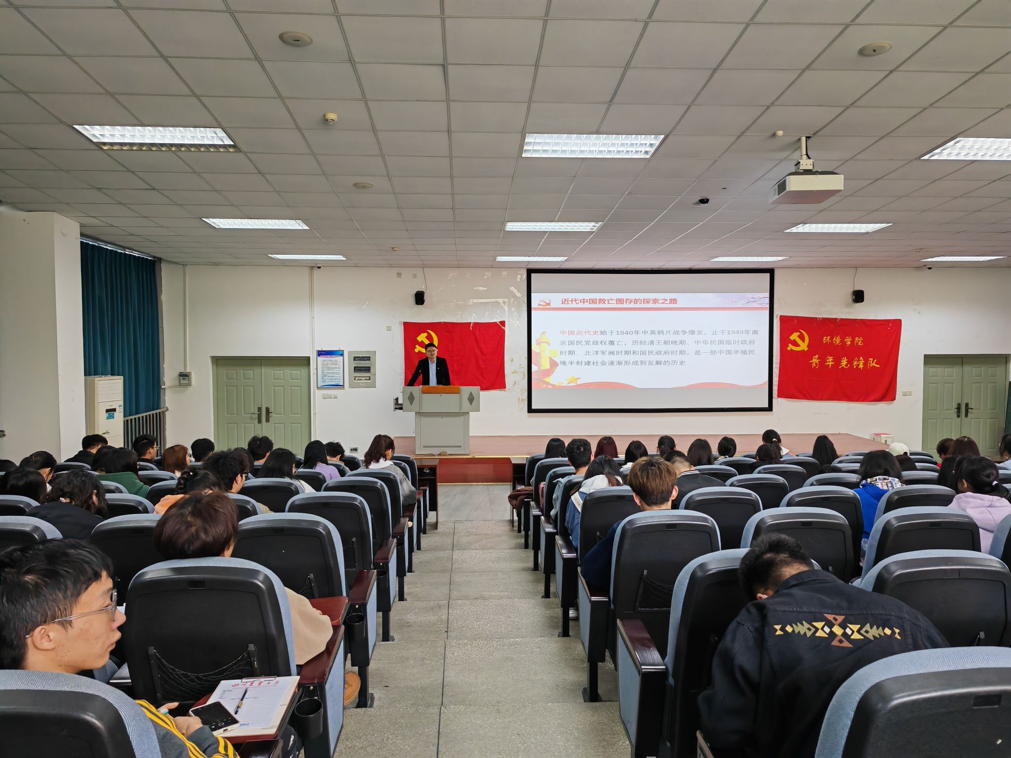3月29日,环境学院党委书记黄成毅在4教A102教室以《中国共产党的指导思想》为题为入党积极分子讲授第五期党课,环境学院2023年春季入党积极分子培训班全体学员参加学习。