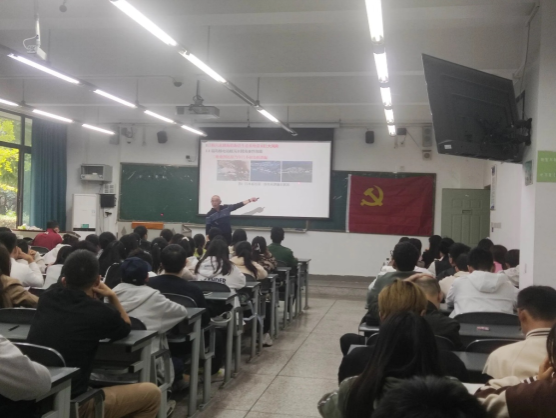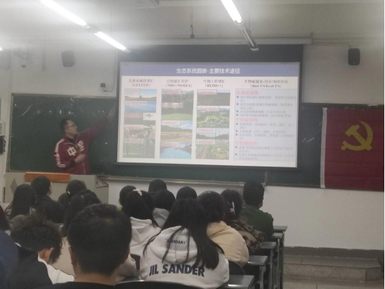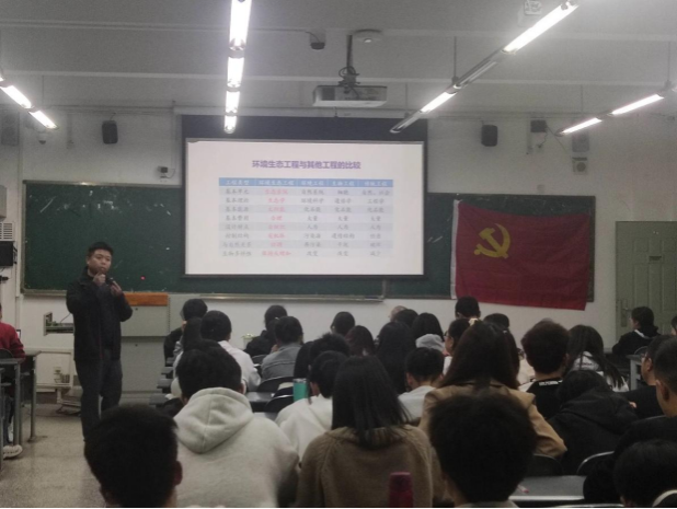 会议伊始,环境学院三位教授党员——程章、张延宗、徐小逊,分别从自身专业角度,分别以“站在院士的高度看生态环保领域的未来发展”、“从日本核污水排放到中国水产对策”、“走进新时代,环境生态工程大有可为”为主题,为新生展开精彩讲座,深度剖析环境生态工程专业与国内环保形势、实时热点问题。程章从国内外关注的双碳目标、新能源和无废城市等热点问题,展示了生态环保未来发展的方向;张延宗从社会关注的核污水排放出发讲到新疆盐碱地智能生态海产养殖基地的建立,凸显了环境生态工程在应对环境热点问题上的关键作用;徐小逊从当今复杂的环境问题之间的联系出发,对比环境生态工程专业与其他环境类专业之间的异同,强调了环保领域对于系统性、可持续性解决生态问题的重要性,并对同学们提出了未来生态文明建设的殷切期望,“希望大家厚植家国情怀,胸怀天下,将个人发展与国家发展紧密联系,从身边的小事做起,做有担当的好青年。发扬不怕苦不怕累的精神,耐得住寂寞,在生态环境事业中贡献自己应有的力量”。