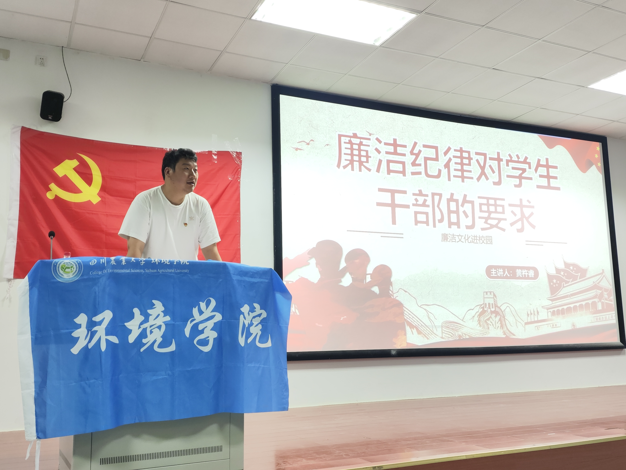 为准确落实中共中央办公厅印发的《关于在全党开展党纪学习教育的通知》,在全院范围内深入开展党纪学习教育,把遵规守纪刻印在心,内化为言行准则,进一步强化纪律意识、加强自我约束,始终做到忠诚干净担当。5月28日,环境学院党委办副主任、团委副书记黄杵睿老师以“廉洁纪律对学生干部的要求——廉洁文化进校园”为主题讲授廉洁专题党课。环境学院学生组织全体学生主干、各小班主要学生干部参会。