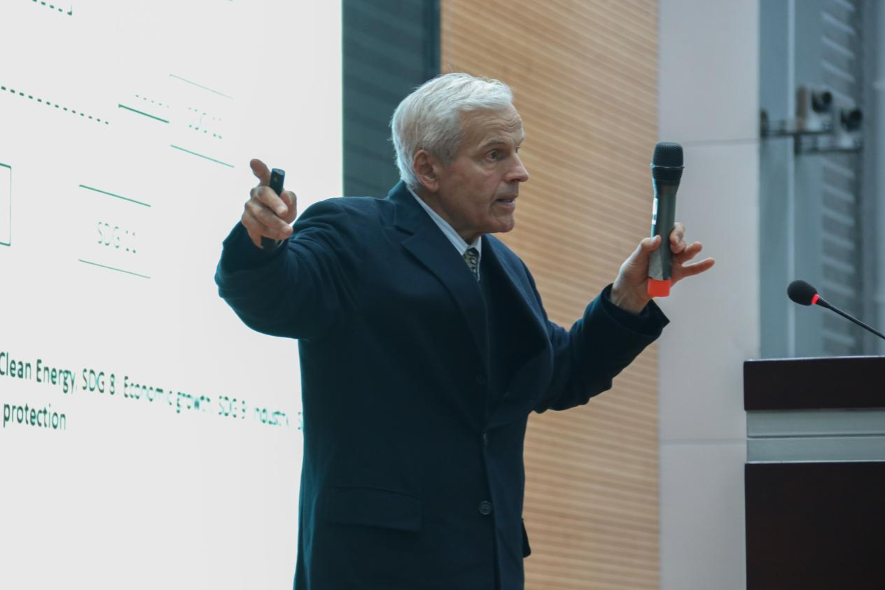 会议伊始,Michael教授向大家分享他在德国洪堡、墨西哥普埃布拉、中国上海的研究经历。随后,他围绕空气污染指数与大气主要污染物等关键要素,梳理了当前全球大气污染发展史及大气环境保护的极端重要性,重点阐释了联合国可持续发展目标(SDG)十七个目标之间的联系及重要性议题。最后,Michael教授结合电动汽车发展方向,强调锂电池研发是自动驾驶增加可持续性的重要技术手段,并深入讨论了当前世界锂矿开采情况及锂矿的可持续开采问题。在提问环节,现场师生踊跃发言,与Michael教授进行了深入的探讨交流。