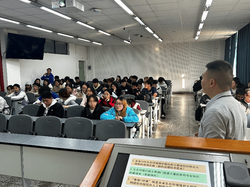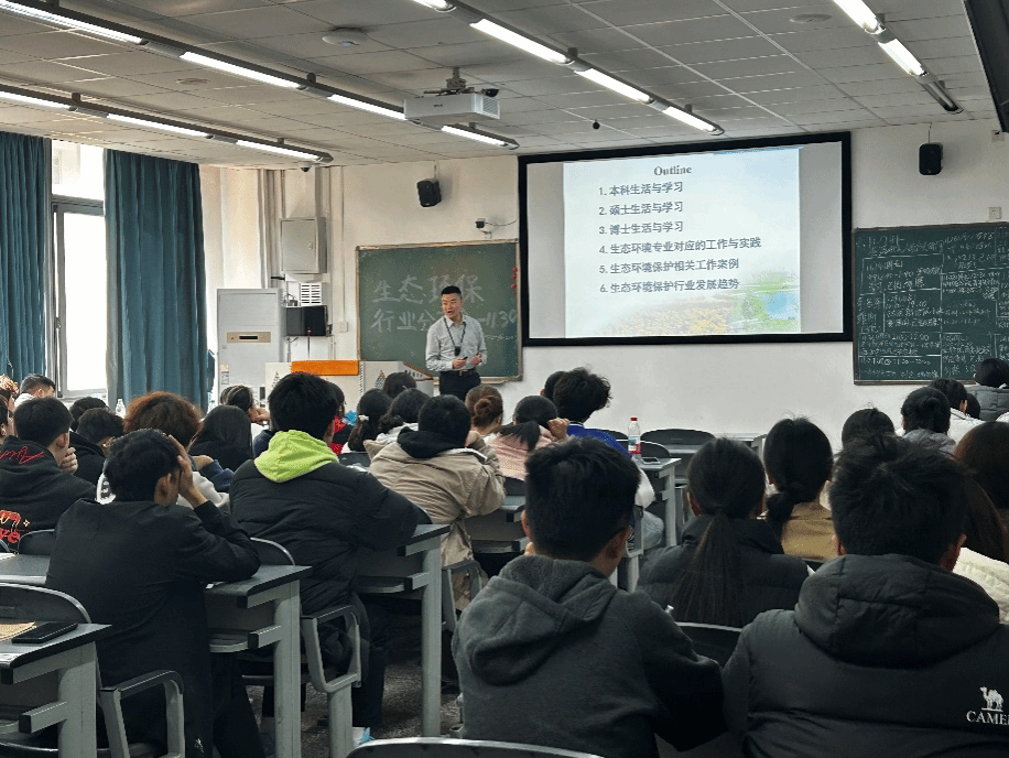 会上,田晓刚所长从本硕博生活与学习、生态环境专业对应的工作与实践、生态环境保护相关工作案例及行业发展趋势五个方面,介绍了自身学生生涯和环保行业工作的丰富经验,并结合当下生态环境领域行业动态和人工智能发展现状,给学生们提出了宝贵的职业发展建议。