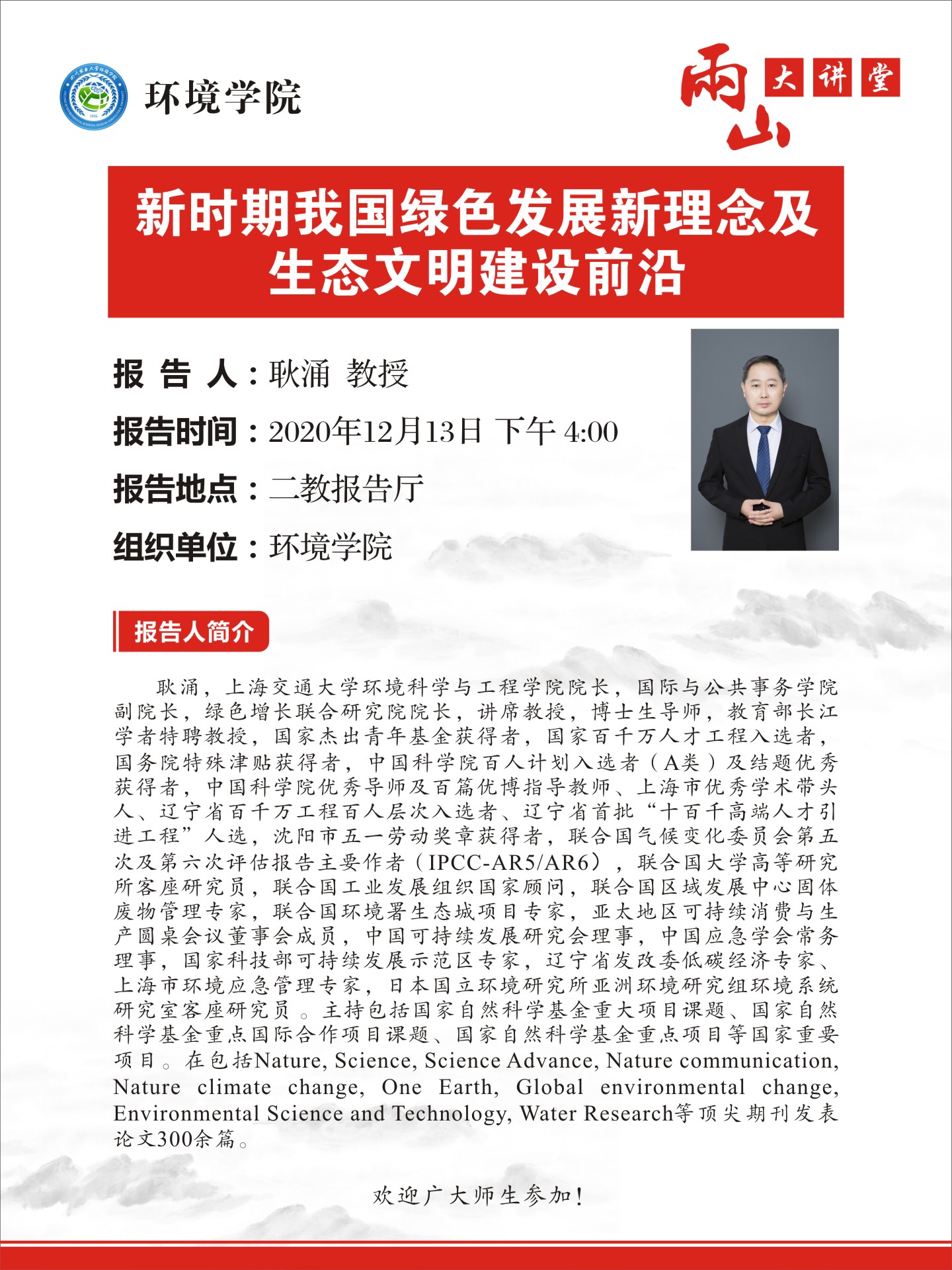 【学术报告】两山大讲堂-新时期我国绿色发展新理念及生态文明建设前沿