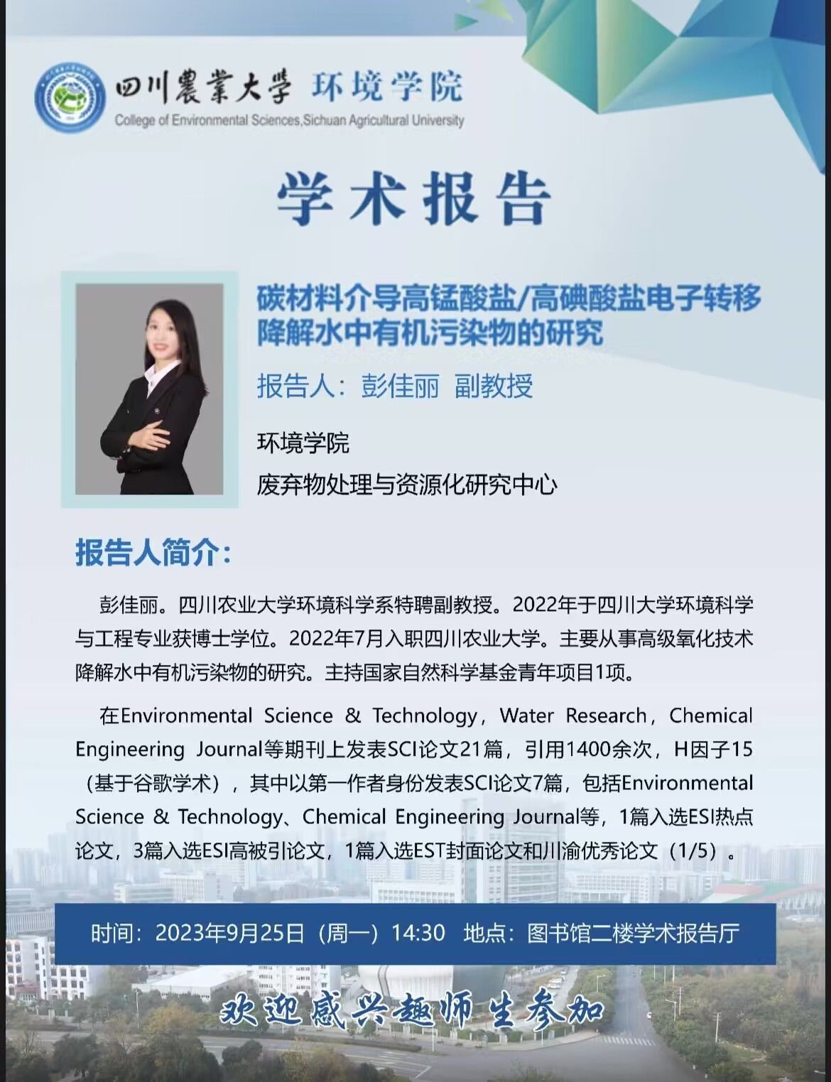 环境学院学术报告——碳材料介导高锰酸盐/高碘酸盐电子转移降解水中有机污染物的研究