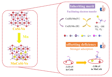 近年来,抗生素作为一类新兴有机污染物在水体环境中的出现引起了广泛关注,如四环素类抗生素。为有效去除水体中的抗生素,tyc5997太阳集团环境学院农业水土环境污染控制与修复团队提出在硅酸钴中(CoSi)引入第二金属Mn制备双金属硅酸盐(MnCoSi),用于活化过一硫酸盐(PMS)降解四环素。MnCoSi/PMS体系在四环素的降解性能上明显优于CoSi/PMS体系,40min内四环素的去除率达到95%以上,其降解速率也增加了3.4倍。其内在增强机制主要表现为两方面:一方面Mn的引入带来了更多的氧空位(Vo),继承了Vo的优势。另一方面,Co、Mn形成的异相活性位点还增强了金属位点对PMS的吸附,弥补了Vo的劣势。该研究不仅为高级氧化体系的优化提供了新视角,还为抗生素废水的去除提供了新策略。