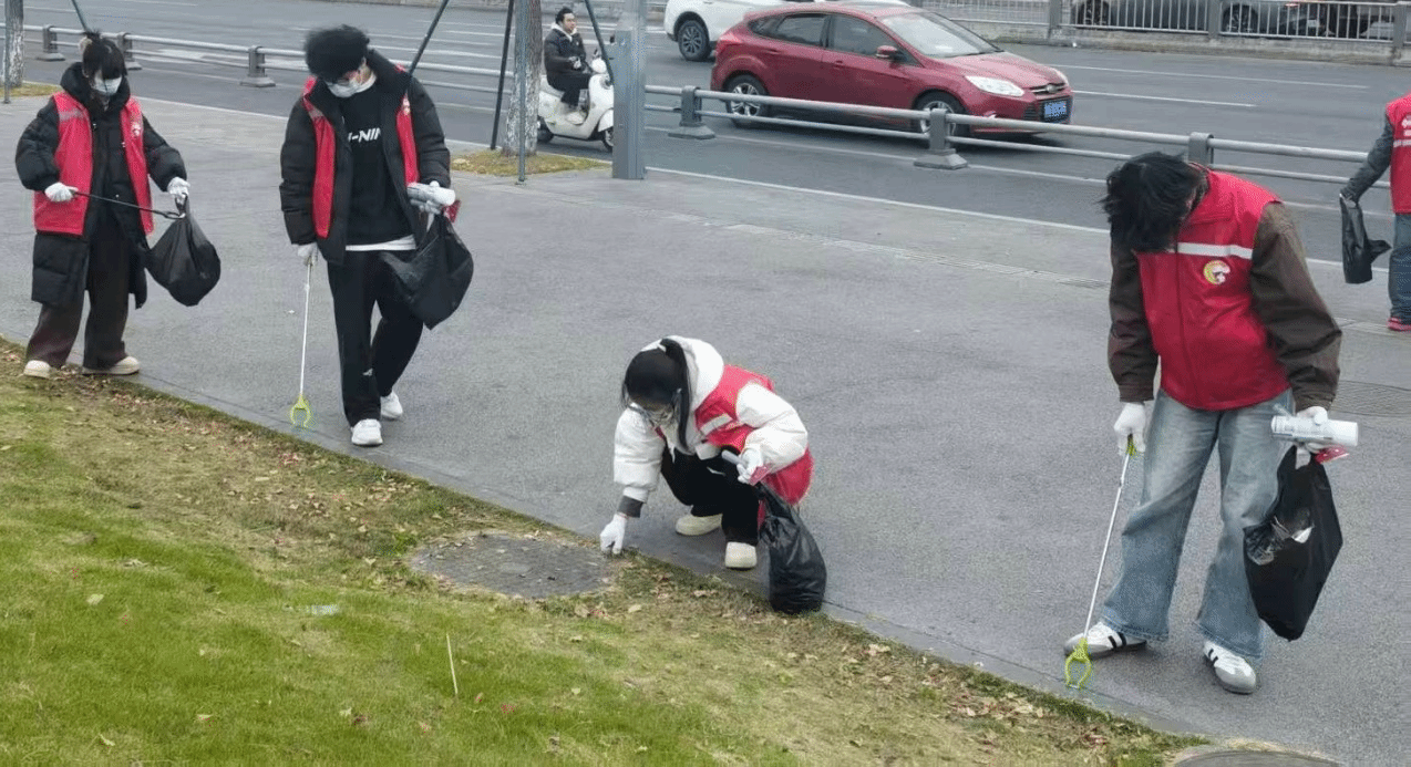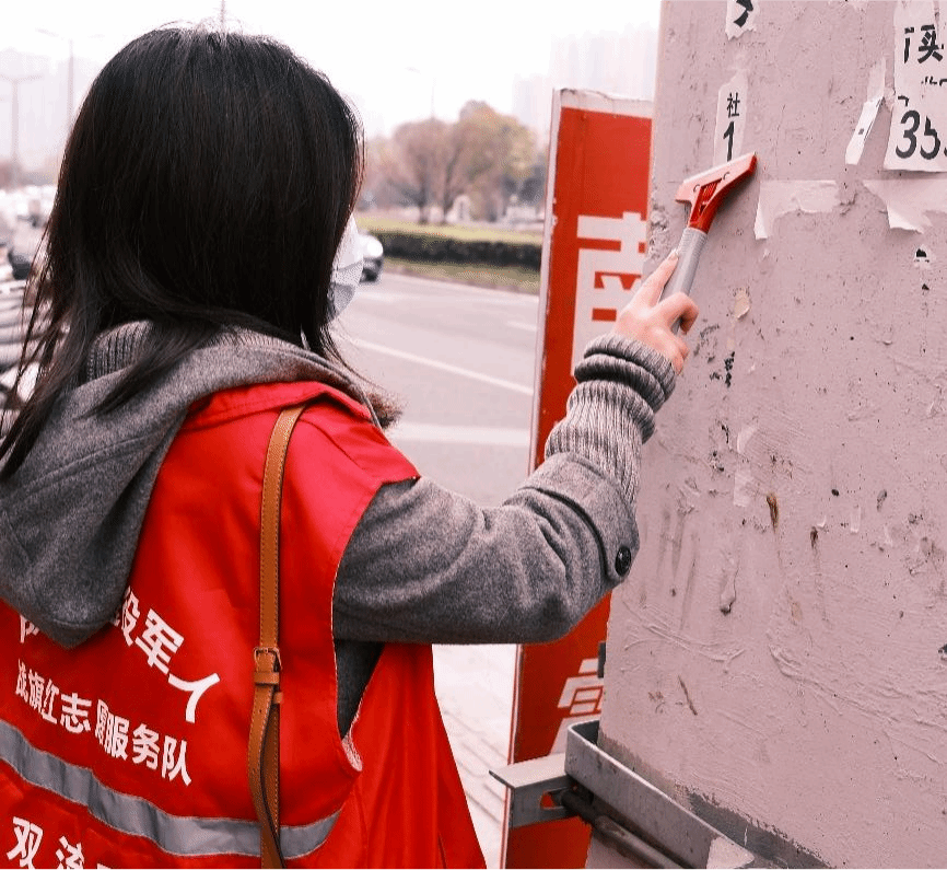 活动期间,实践队志愿者在社区工作人员的统一安排下,身着红色志愿马甲,佩戴手套、口罩,携带各类清理工具,分为两组从社区两侧同步推进,对社区公共区域进行全面环境清理。志愿者们分工协作,部分队员使用垃圾捡拾器与垃圾袋,细致清理绿化带、道路旁的废弃杂物;另一部分队员则手持清洁铲刀,重点清除墙面、公共设施上的非法小广告,恢复社区整洁面貌。