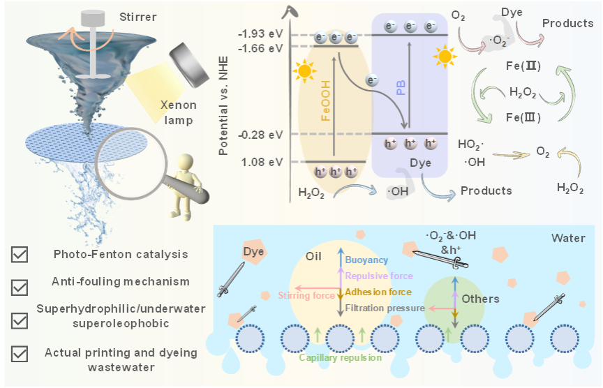 传统膜分离技术易受污染物吸附或堵塞的影响,导致膜污染问题频发,不仅增加了运行成本,更与碳中和目标下的节能需求相矛盾。为此,研究团队提出创新解决方案,通过构建双铁基催化功能膜材料,实现了污染物吸附与催化降解的协同处理。研究团队进一步阐明了材料催化降解污染物的作用机制,并通过连续流处理系统验证了其优异的抗污染性能,在实际印染废水环境中也展现出持续稳定的净化效果,为绿色低碳的废水处理技术开发提供了新思路。