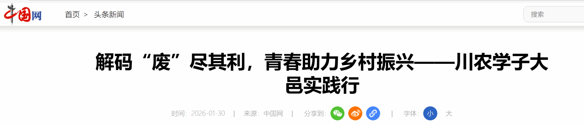 为深入贯彻“十五五”乡村振兴与“双碳”目标部署,一支由16名研究生与本科生组成的实践团队,奔赴大邑县王泗镇白衣村,携手成都宏吉博润环保科技有限公司,开展以“农业废弃物资源化利用”为核心的寒假社会实践活动。团队以科技为笔、以田野为纸,书写青年助力绿色乡村建设的生动答卷。