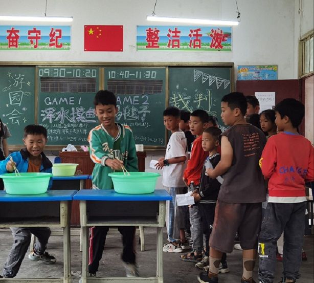 为让小朋友们以更加积极的态度参与各项活动,同时让支教队更融入小朋友们的生活,与小朋友们相处能更融洽、更自然,支教队队员多次讨论、反复调整,最终确定了“提高积极参与度,培养合作意识”的活动主题,并精心准备了“浑水摸鱼”、“甩水杯”、“白面书生”、“背对背传气球”等十项兼具特色与趣味性的游园活动游戏。