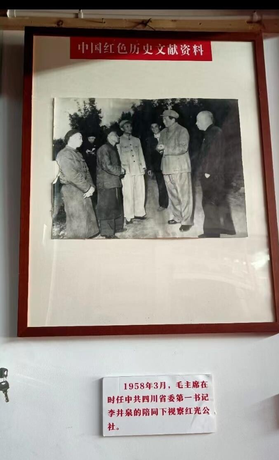 最后我们看到1958年三月毛主席在时任中共四川省委第一书记李井泉的陪同下视察红光公社,在纪念馆的小玻璃柜子里,存放这当时红光镇红色发展道路,在毛主席视察过红光镇后,红光人民在其精神指示下,坚持党的领导,听从安排,才有了红光如今耀眼的发展。如今的中国的军事科技已居世界前列,各种型号的飞机大炮数不胜数。然而以前的生活是多么辛酸,然而这种不畏艰险、奋勇向前、听党指挥的革命精神不正激励着我们吗?观看了这些久远的纸质资料,我们更加坚信不管当今的科技多发达却依旧要保持吃苦耐劳的品质,才能让祖国的未来发展的越来越好。