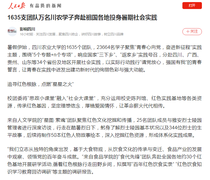 川农青年学子始终将“爱国敬业、艰苦奋斗、团结拼搏、求实创新”十六字精神铭刻心中,将理论知识深刻融入鲜活实践,将学习体悟灵活转为实践行动,用脚步丈量祖国大地,用眼睛发现中国精神,用耳朵倾听人民呼声,用内心感应时代脉搏,以诚心、真心、悉心向社会展现农林高校学子的新面貌、新姿态、新本领,以青春建功行动来为绘制中国发展新图解注能加力,为自己的青春增添一抹色彩。