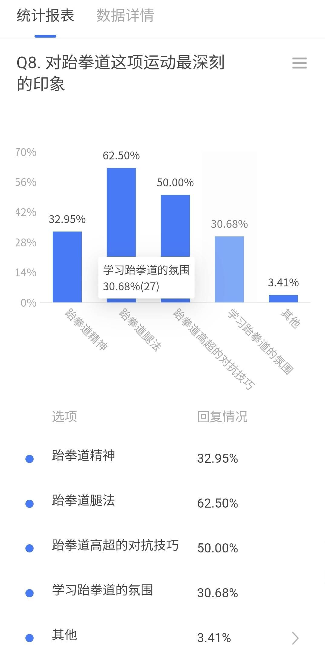 1. 问卷反映出青年对跆拳道腿法及竞技技巧具有深刻印象。