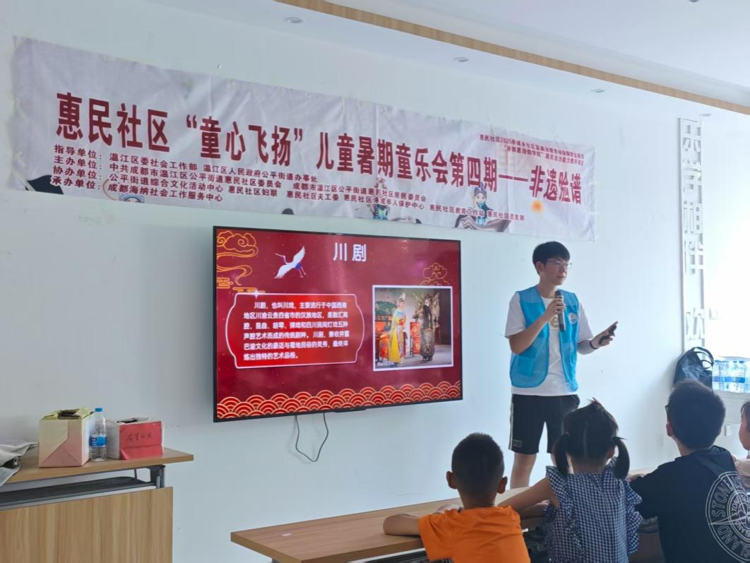 为推动非物质文化遗产活态传承与乡村振兴深度融合,环境学院“强农兴国·理论宣讲”学生实践团于2025年暑假深入惠民社区为老服务站,以“川剧脸谱文化”为主题开展实践活动。通过理论宣讲与创意实践相结合的形式,团队引导社区儿童感知传统戏曲魅力,为乡村文化振兴注入青春力量。