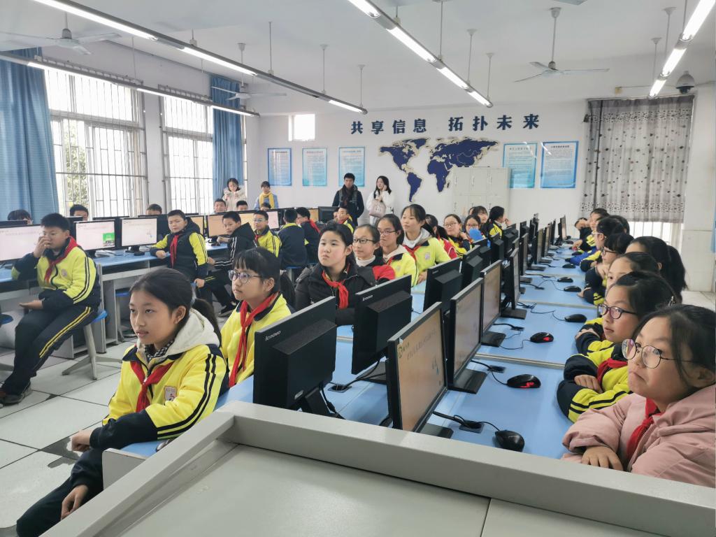 上一节课的下课铃刚敲响,孩子们就争先恐后地跑进机房,两分钟时间不到,已经坐在了自己的位置上。志愿者王晴由地球的形状引出讲课主题地球圈。孩子们纷纷举手,希望将自己心中地球的形状画在黑板上。志愿者王晴将地球的立体形状画出,便开始了相关知识的讲解。同学们积极参与互动,逐渐加深了对地球圈概念的理解。志愿者把对不同圈层的讲解与生活中各种环保行动结合起来,从生活实际中帮助孩子们培养绿色环保生活的习惯。在提及水圈时,同学们反应极其强烈,不断提出“女人是水做的”、“水是生命之源”等观点,将课堂讨论的气氛推向了高潮。