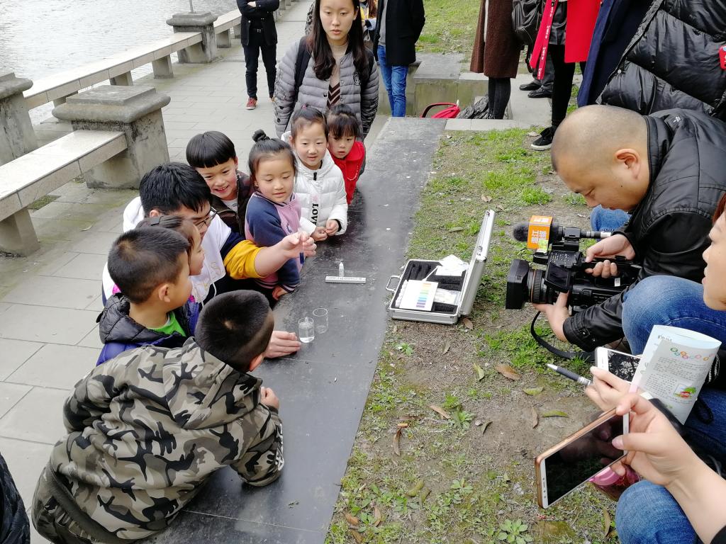 14:00,青工部志愿者与温江区人民政府柳城街道办事处一同带领乐乐幼儿园的大班小朋友们进行了此次水质检测活动。本次活动温江新闻进行了采访报道,在媒体记者的采访下,志愿者讲到:“本次活动开展的目的是宣传水资源保护,向小朋友科普身边的水质情况,通过一些物质的测试带来直接的感官体验。”