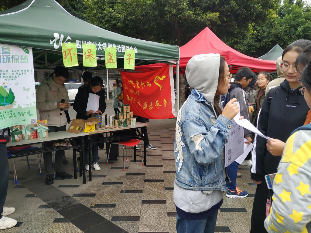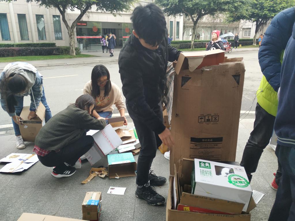 11月15日,同学们在食堂小广场设点宣传“环保盒子”活动,吸引了很多同学参加,16日收到了近30个订单,负责人依据寝室位置以及下寝回收人员的空闲时间做出回收安排。此后,同学们将盒子堆放在集合处进行清点和整理,对纸箱及瓶子进行归类、回收。整个过程分工明确,有条不紊。