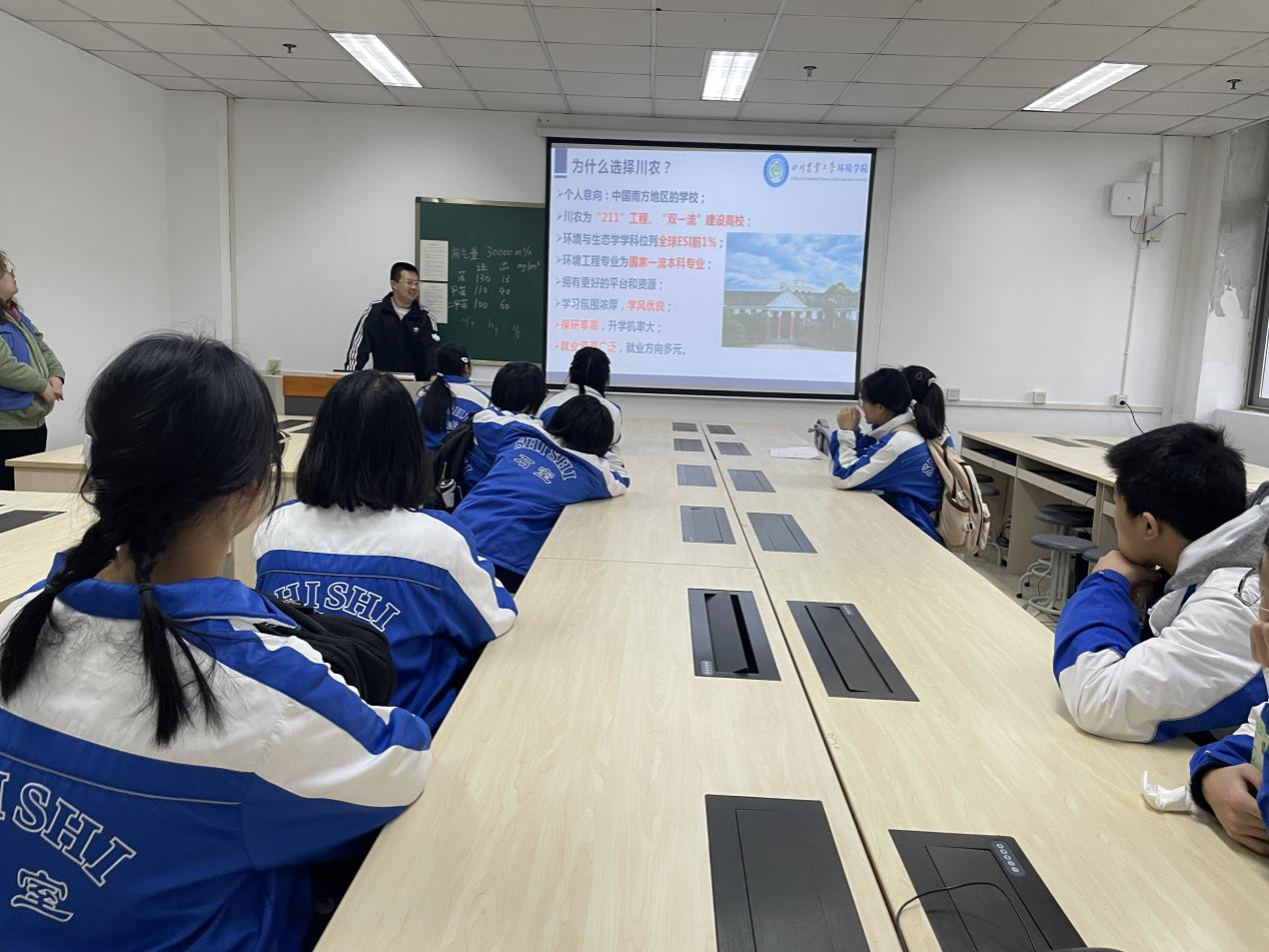 随后,环境工程2021级学长詹海权为同学们分享了自己的学习生活经历。他回顾了自己与川农结缘的每一个重要时刻,以实例展现了tyc5997太阳集团这所百年学府深厚的文化底蕴和环境学院独特的学术魅力,并简要介绍了招生特色与录取要求,包括奖学金体系、保研机会、国际合作项目等予以说明,为同学们规划未来求学之路提供了宝贵的参考信息。他特别强调了学院在科研创新、实践教学以及保研考研方面的优势,鼓励在座的每一位同学积极报考tyc5997太阳集团环境学院,指出无论是对环境学科抱有兴趣,还是希望在环保领域有所作为,这里都是未来的理想选择之一。