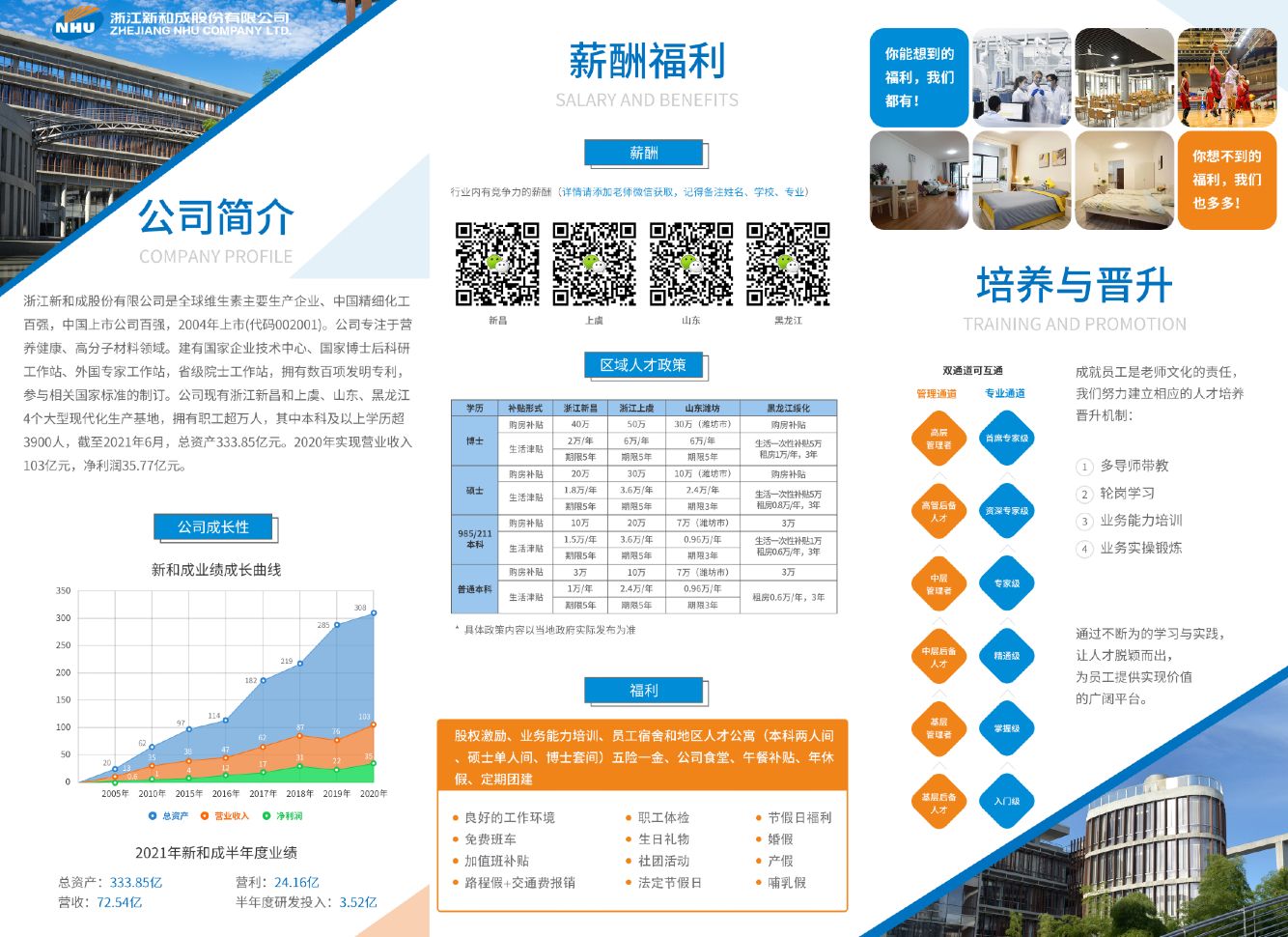浙江新和成股份有限公司是一家专注于精细化工功能性产品的研发和生产的上市企业(代码002001),在营养品、香精香料、高分子新材料等领域为全球100多个国家和地区提供产品和解决方案。公司是中国精细化工百强、中国上市公司百强,现有浙江新昌和上虞、山东、黑龙江4个大型现代化生产基地,建有国家企业技术中心、国家博士后科研工作站、外国专家工作站、省级院士工作站,拥有数百项发明专利,主持、参与制订国家/行业标准38项。拥有职工超万人,其中本科及以上学历超3900人,总资产333.85亿元。2020年实现营业收入103亿元,净利润35.77亿元。