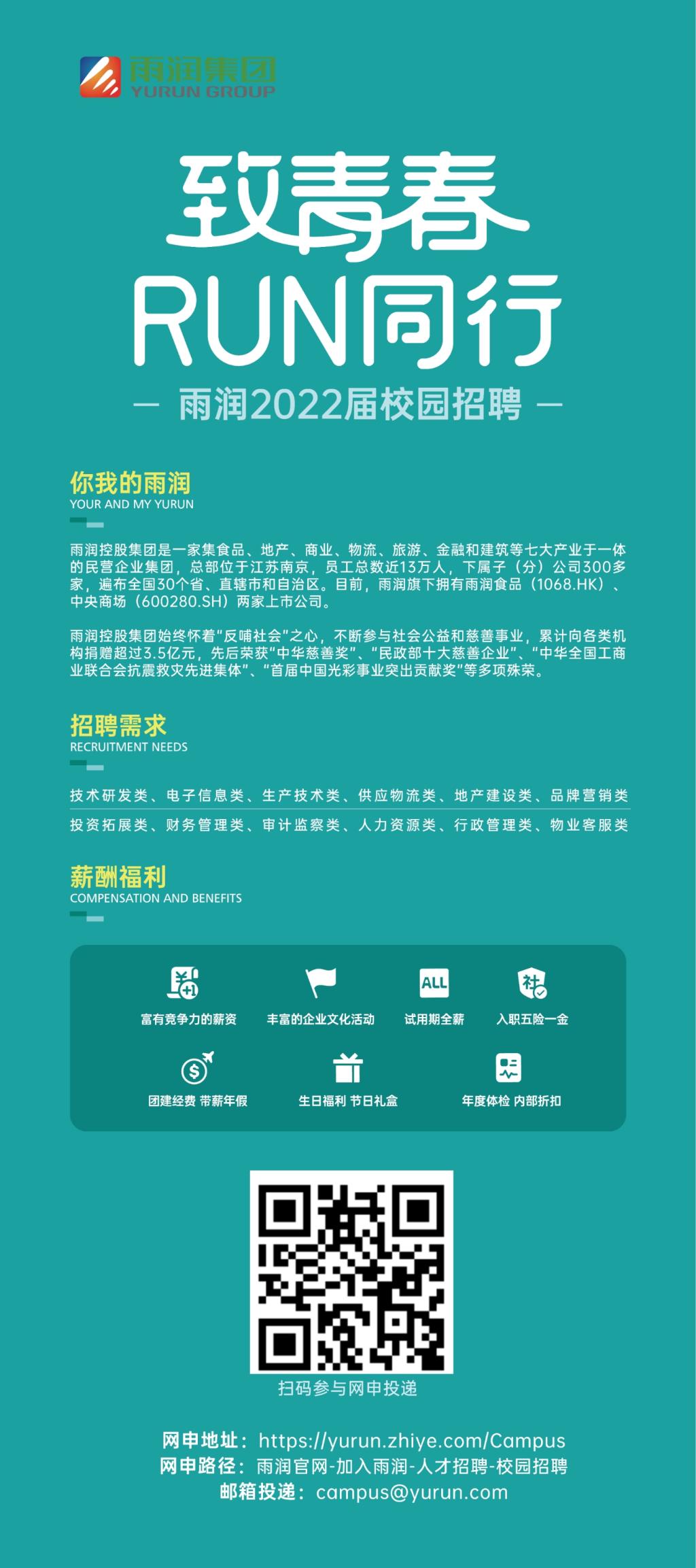 雨润集团2022届秋季校园招聘来啦!雨润控股集团是一家集食品、地产、商业、地产、旅游、金融和建筑等七大产业为一体的民营企业集团总部位于江苏南京,目前雨润旗下拥有雨润食品和中央商场两家上市公司。根据集团发展战略需要,雨润集团2022届校园招聘需求为2000人。快来扫码投递简历呀!更多详情可加校招群了解哟!