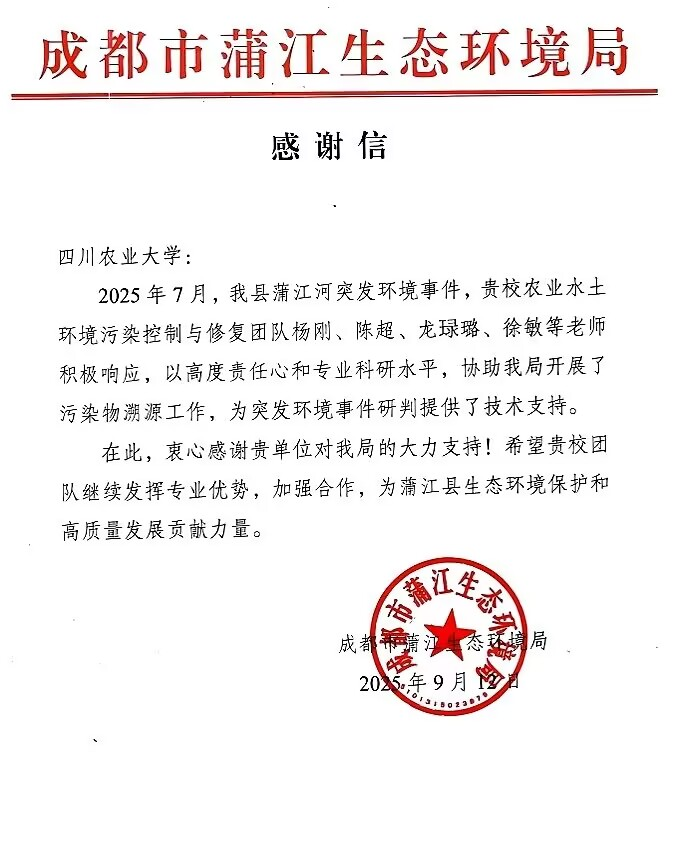 近日,成都市蒲江生态环境局向我校发来感谢信,对我院农业水土环境污染控制与修复团队在突发环境事件处置中提供的关键技术支持致以诚挚谢意,高度肯定团队专业高效的技术能力与协作奉献的责任担当。