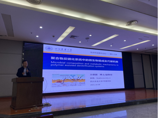 10月28日下午,由环境学院、生态环境研究所联合主办、生态文明(温江)研究中心协办的“生态环保青年论坛”在图书馆二楼报告厅举行。环境学院方德新副教授以“聚合物反硝化系统中的微生物组成及代谢机制”为题,为学院本科生、硕士、博士及多名学院教师作报告。报告会由宋春副教授主持。