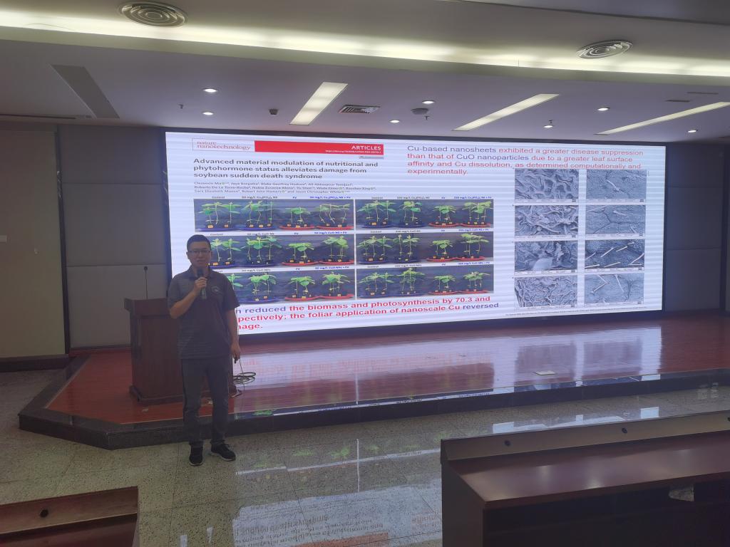 报告会上,宋春副教授结合目前以生态环境友好为目标的可持续农业的研究瓶颈问题及21世纪纳米科技的研究现状,介绍了纳米科技助力可持续农业方面的研究前景,重点阐述了不同纳米金属和类金属材料作为生长调节剂助力作物抗病、作为改良剂修复重金属污染土壤以及利用农业废弃物绿色合成纳米材料及其应用等方面的研究工作,综合探讨了未来可持续农业中纳米科技的应用前景及注意事项,为更好的推动纳米科技在可持续农业上的应用提供了新思路。同时宋老师结合自身研究过程中遇到的学术问题,与同学们进行了良好的互动。