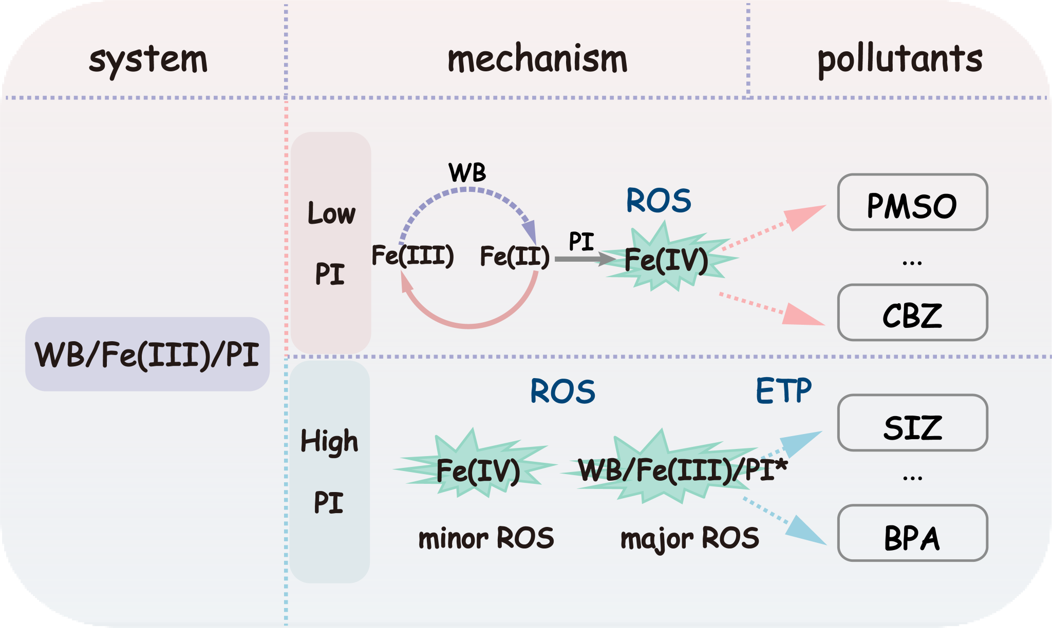 目前,水中新型有机物污染已成为水安全不可忽视的问题,而传统物理、生物处理等技术对大多数新型有机物处理效率低,因此,化学氧化技术受到了广泛的关注。高碘酸盐作为一种新兴氧化剂,常被用于水处理氧化各类污染物。铁离子强化高碘酸盐的能力有限,而引入催化剂硼化钨能显著增强高碘酸盐氧化水中抗生素的能力。此外,研究发现高碘酸盐浓度能诱导不同的氧化机制,在低的高碘酸盐浓度下,体系产生高活性的高价铁能快速降解污染物,而在高的高碘酸盐浓度下,体系通过电子转移机制持续氧化具有富电子的污染物。此方法的环境适应性强,可根据水体污染的不同需求,通过简单调控氧化剂浓度来实现污染物的高效去除,为水污染的净化提供了新思路。