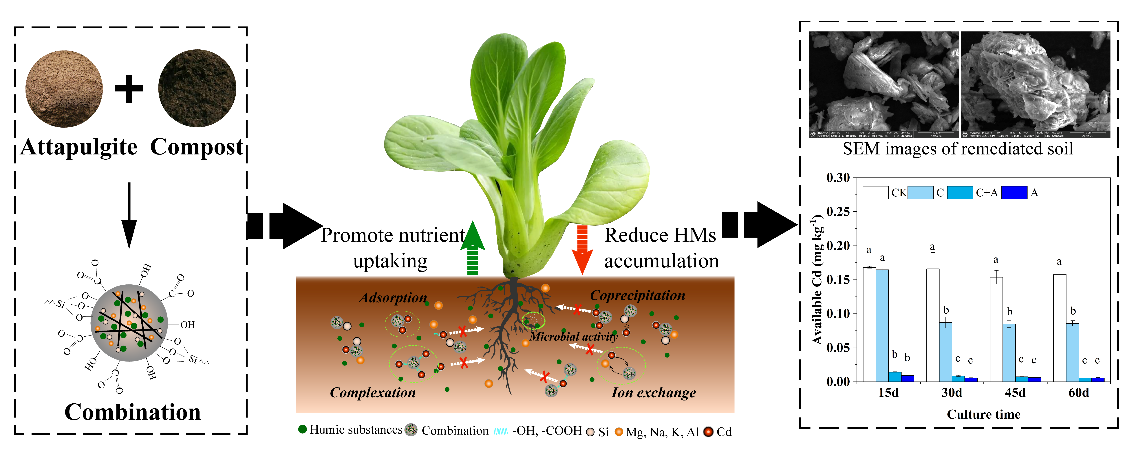 农用地土壤污染防治和安全利用是《中共中央、国务院关于深入打好污染防治攻坚战的意见》的主要内容。近日,环境学院土壤污染过程与修复创新团队以堆肥和黏土矿物联用,用于农田土壤Cd钝化修复。堆肥与黏土矿物联用显著降低了土壤Cd的生物有效性,增加了土壤有机质、速效养分含量和脲酶、蔗糖酶和过氧化氢酶活性。该研究利用黏土矿物凹凸棒土特殊的层状结构和组成与堆肥联合,形成较稳定配合物和丰富的官能团,通过吸附、络合、共沉淀和离子交换等途径达到Cd的固定。该研究为Cd污染农用地重金属污染防治和安全利用、土壤质量提升提供了新途径,具有巨大的应用潜力。