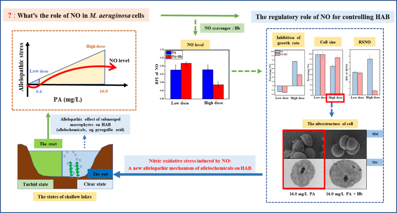 水体富营养化和有害藻华(HABs)一直以来是备受关注的水环境污染问题,利用水生植物化感作用对抑制有害藻华生长和构建健康的水生态系统起着至关重要的作用,但其机理仍有待深入系统研究。我院环境规划与管理学科方向何燕老师首次探讨了生物活性分子一氧化氮(NO)在水生植物分泌的典型多酚类化感物质焦性没食子酸(PA)抑制水华蓝藻铜绿微囊藻Microcystis aeruginosa过程中的双重作用。在低强度化感胁迫下,胞内NO发挥抗氧化功能,重建铜绿微囊藻胞内氧化还原环境的稳态。当化感应激增加至一定阈值,胞内NO与活性氧(ROS)共同作用产生RNS,RNS修饰蛋白质和脂质,导致一氧化氮氧化应激和不可逆的细胞损伤。研究结果强调了NO在淡水生态系统中水生植物对蓝藻铜绿微囊藻化感抑制中的双重作用。