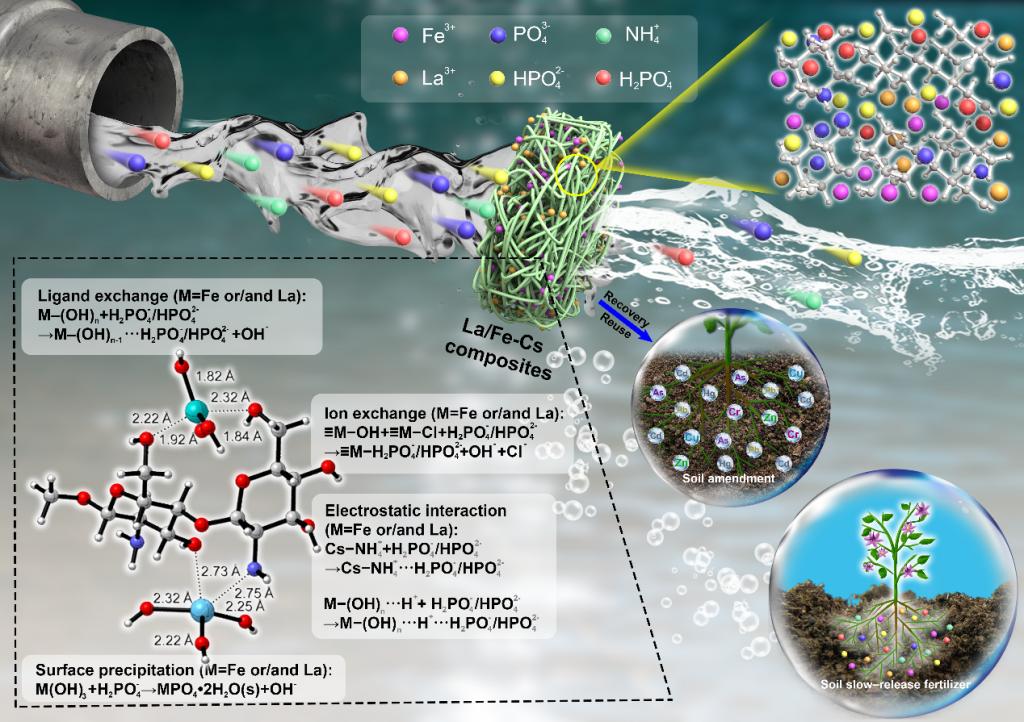 鉴于此,tyc5997太阳集团环境学院张世熔教授课题组以天然高分子材料壳聚糖为载体,利用与磷酸盐较强亲和力的FeCl3LaCl3进行联合改性,构建了稳定且具高比表面积的新型双金属负载壳聚糖基磷吸附剂(La/Fe-Cs)。该材料可高效去除废水中的磷酸盐(67.52 mg g–1),对磷酸盐的吸附速度更快且更稳定。同时该吸附剂对实际富营养化水体和养殖废水中磷酸盐的捕获也表现出优异的潜力。研究结果为高效去除和回收利用废水中的磷酸盐提供了有效的策略。