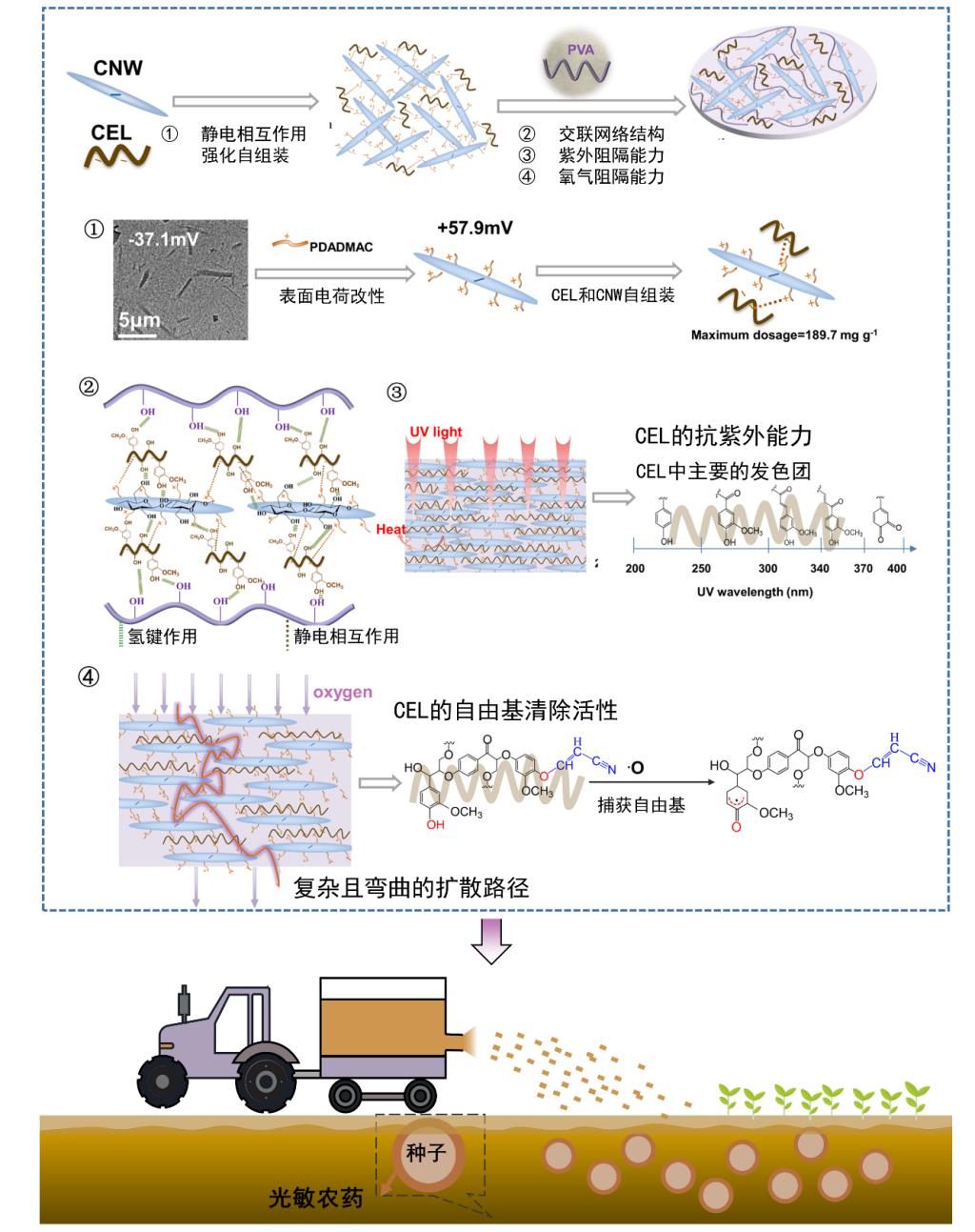 在现代农业中,传统塑料地膜的不合理的处置造成了土壤污染和土壤退化等环境问题。因此,利用生物质基液体地膜替代传统塑料地膜这一观点受到了越来越多的关注,然而生物质基液体地膜往往表现出较差的屏障性能,这限制了其在农业生产环境中的应用。本研究的液体地膜采用氰乙基化水溶性木质素(CEL)耦合纤维素纳米晶CNW (CEL@CNW),再与聚乙烯醇(PVA)基体共混制备。CEL的加入介导了液体覆盖膜的分层结构的形成,从而进一步提高了其整体阻隔性能。研究结果表明,液体地膜具有良好的紫外阻隔能力(CEL@CNW添加量为10 wt%时,在紫外光波长为200 nm时透过率达到~0%)和氧气阻隔能力(CEL@CNW添加量为5 wt%时,氧气透过率仅为~0.12 cm3 m-2 d-1 kPa-1),可用于光敏农药阿维菌素的光降解保护。PVA/CEL@CNW液体地膜还具有良好的土壤耐水性,能够促进玉米种子萌发和幼苗生长,验证了其在农业生产环境中的应用潜力。本研究为利用水溶性木质素进行工业废木质素的价值稳定提供了一种新策略,同时也为液体地膜的制备和应用提供了技术平台,以实现农业的可持续发展。